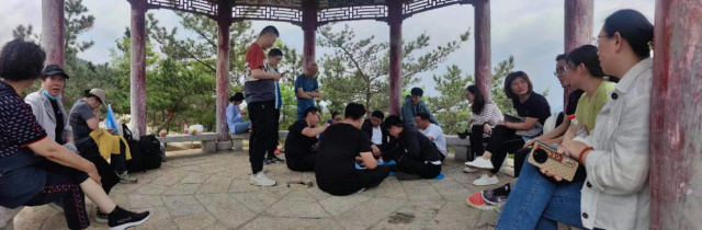我們不僅是一個團隊,還是一個有愛的大家庭,大家在山頂休憩,互相分享美食。